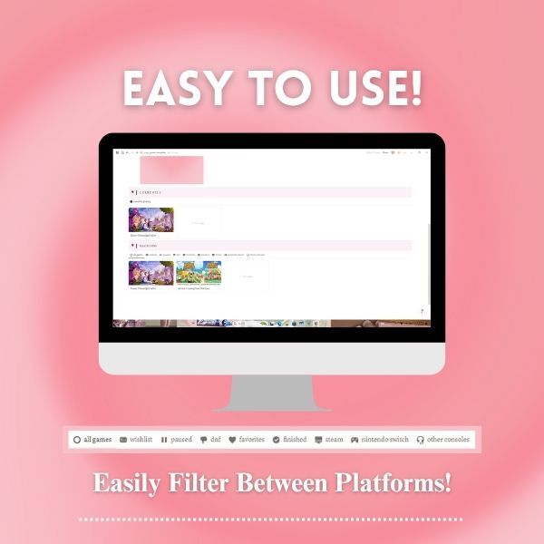 This is where my Cozy Gamer Notion Template comes in! Easily filter between platforms making it easy to find your favorite games, move games from your wishlist to backlog with ease & more!